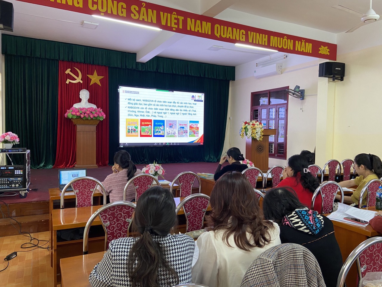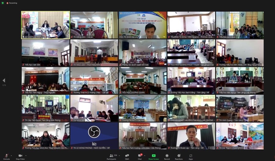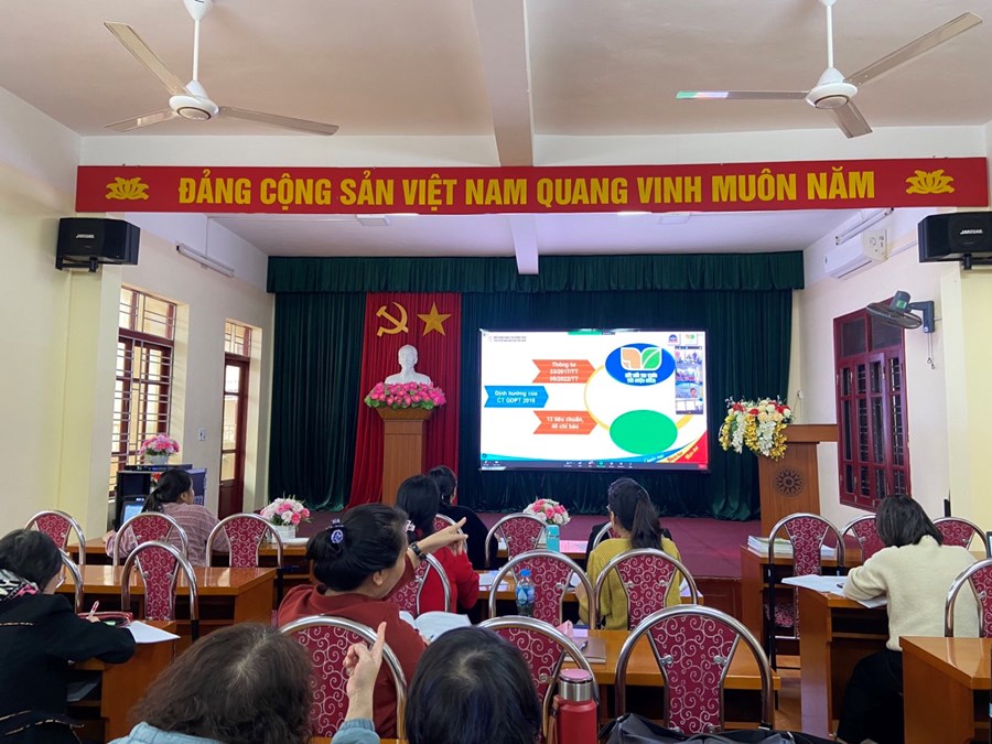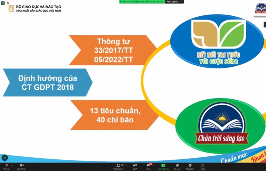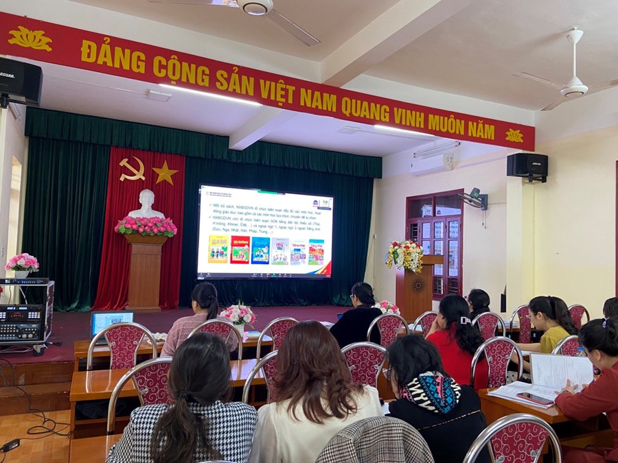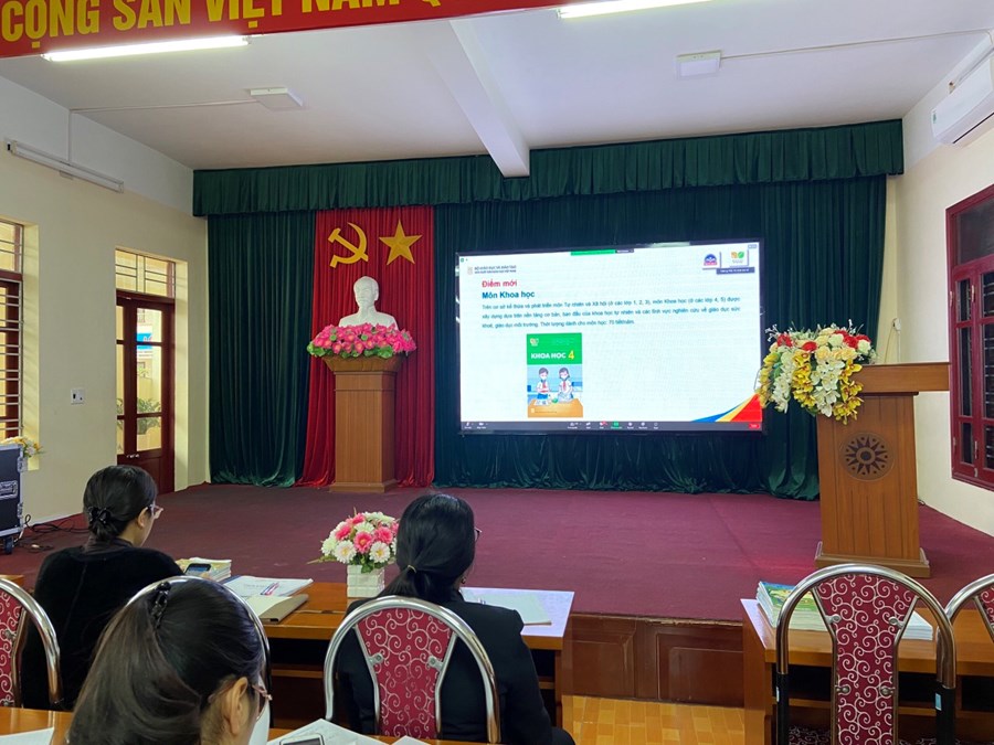 Thứ tư - ngày 14/2/2023, Thực hiện Thông tư số 25/2020/TT – BGDĐT ngày 26/08/2020 của Bộ Giáo dục và Đào tạo quy định việc lựa chọn sách giáo khoa trong cơ sở giáo dục phổ thông; căn cứ quyết định số 4434/QĐ – BGDĐT ngày 21/12/2022 và Quyết định số 45/QĐ- BGDĐT ngày 09/1/2023 của Bộ giáo dục và Đào tạo về việc phê duyệt sách giáo khoa lớp 4 sử dụng trong cơ sở giáo dục phổ thông, Sở Giáo dục và Đào tạo phối hợp với các nhà xuất bản tổ chức Hội thảo giới thiệu sách giáo khoa và thiết bị giáo dục lớp 4. Các đồng chí trong Ban giám hiệu nhà trường cùng các đ/c khối trưởng chuyên môn, giáo viên dạy lớp 4, giáo viên Âm nhạc, Mĩ thuật đã nghiêm túc tham gia Hội thảo trực tuyến giới thiệu SGK, thiết bị giáo dục lớp 4 theo chương trình phổ thông 2018.