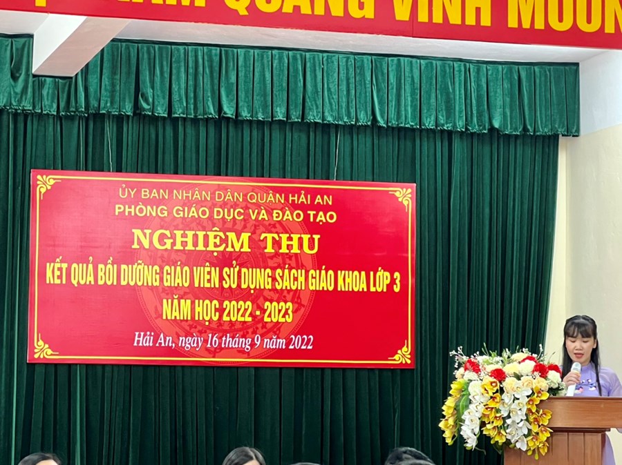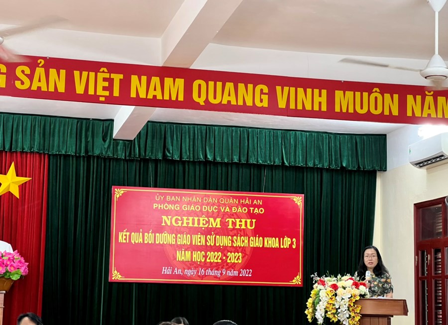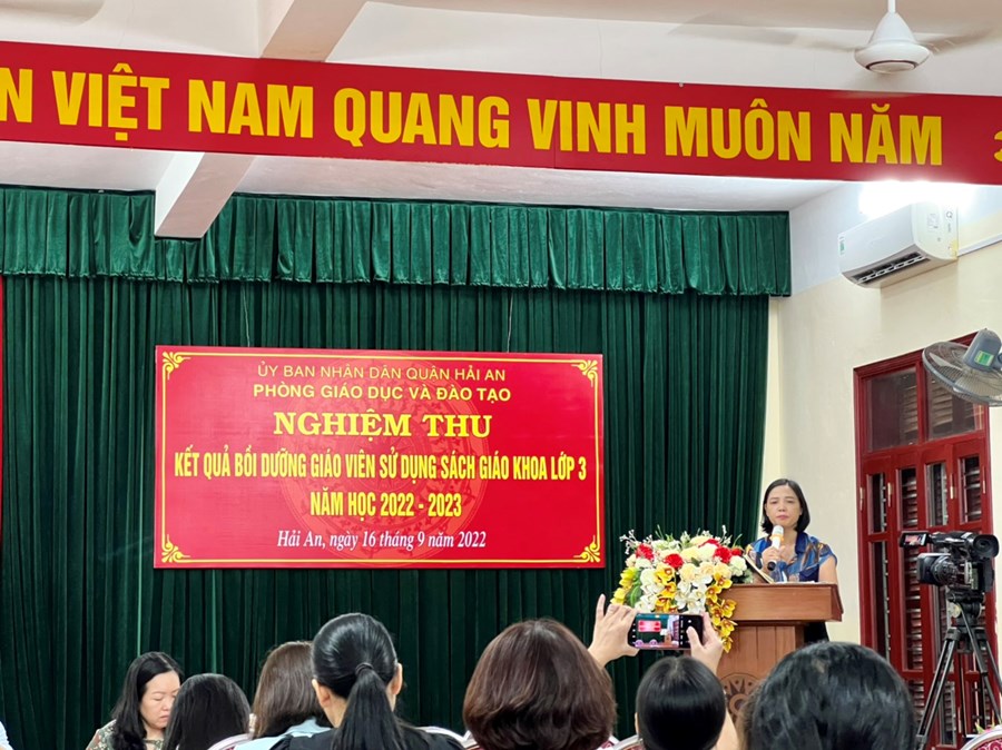 Thực hiện Kế hoạch số 65/KH – SGDĐT- TH ngày 23/5/2022 của Sở Giáo dục và Đào tạo về việc tổ chức đợt bồi dưỡng giáo viên sử dụng sách giáo khoa lớp 3 năm học 2022 – 2023. Sáng ngày 16/9/2022, tại trường Tiểu học Đằng Lâm, Phòng Giáo dục và Đào tạo quận Hải An đã tổ chức nghiệm thu kết quả bồi dưỡng giáo viên sử dụng sách giáo khoa lớp 3 năm học 2022- 2023. Các nhà trường đã tổ chức dạy nghiệm thu các môn học: Công Nghệ, Toán, Tự nhiên và Xã hội và Tiếng Việt. Về dự các tiết học cùng với thầy trò quận Hải An có đồng chí Trần Thị Thu Hằng – Trưởng phòng Tiểu học - Sở GD&ĐT, đồng chí Nguyễn Thị Minh Thu - Trưởng phòng GD&ĐT quận Hải An , các đồng chí chuyên viên Sở GD&ĐT, Phòng GD&ĐT, các đồng chí cán bộ quản lý các nhà trường, khối trưởng các khối và giáo viên khối 3 trong toàn quận.