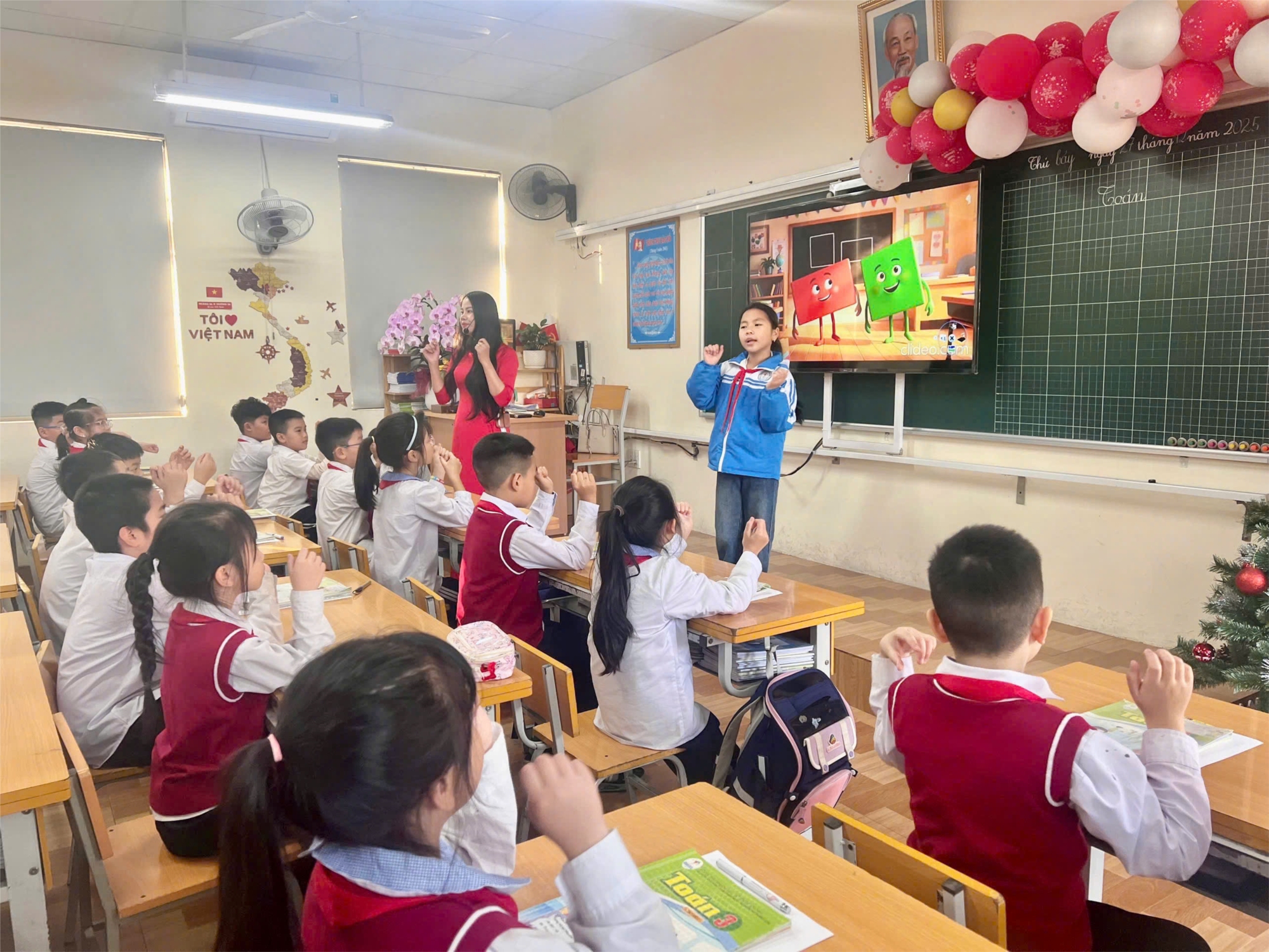 Để minh họa cho chuyên đề, tập thể giáo viên khối 3 đã lựa chọn tiết 2 bài: “Tính chu vi hình chữ nhật, chu vi hình vuông” (SGK Toán 3 – trang 105). Tiết dạy được tổ chức khoa học, sinh động, mở đầu bằng hoạt động khởi động vui tươi, tạo không khí hứng khởi cho học sinh. Trong phần luyện tập – thực hành, giáo viên đã sử dụng công cụ Plickers để kiểm tra, đánh giá nhanh kết quả học tập của học sinh; tổ chức cho học sinh làm việc nhóm, trao đổi, hỏi – đáp, vận dụng kiến thức vào các bài toán thực tế. Việc ứng dụng AI và các hiệu ứng trong bài giảng điện tử giúp học sinh dễ hiểu, nắm chắc cách làm và thực hiện bài toán một cách hiệu quả.