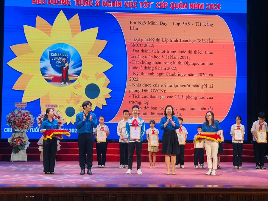 💐Tại chương trình, em Ngô Minh Duy, lớp 5A8 được biểu dương "Dũng sĩ nghìn việc tốt" cấp Quận năm 2023. Với những thành tích đạt được đó, em Ngô Minh Duy xứng đáng là niềm tự hào của bố mẹ và thầy cô trường Tiểu học Đằng Lâm🌼🌼🌼