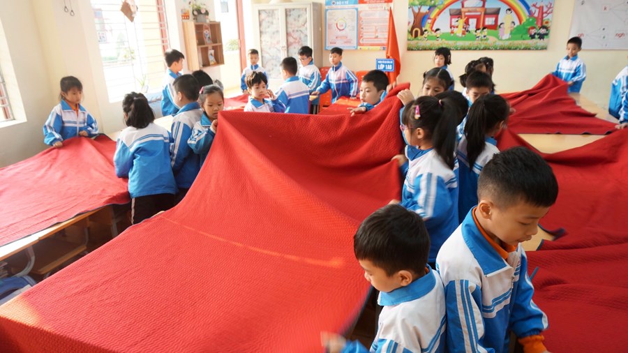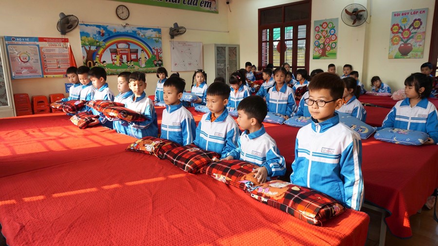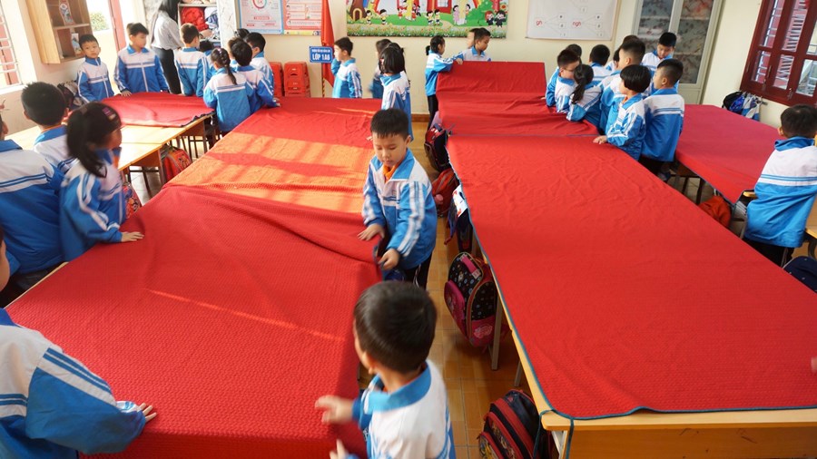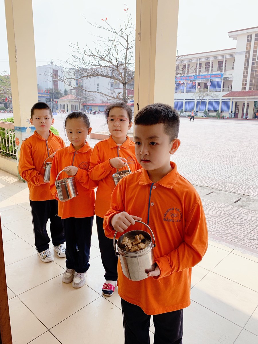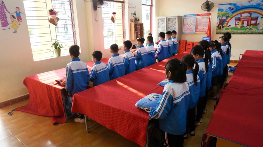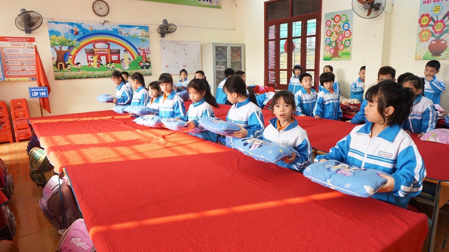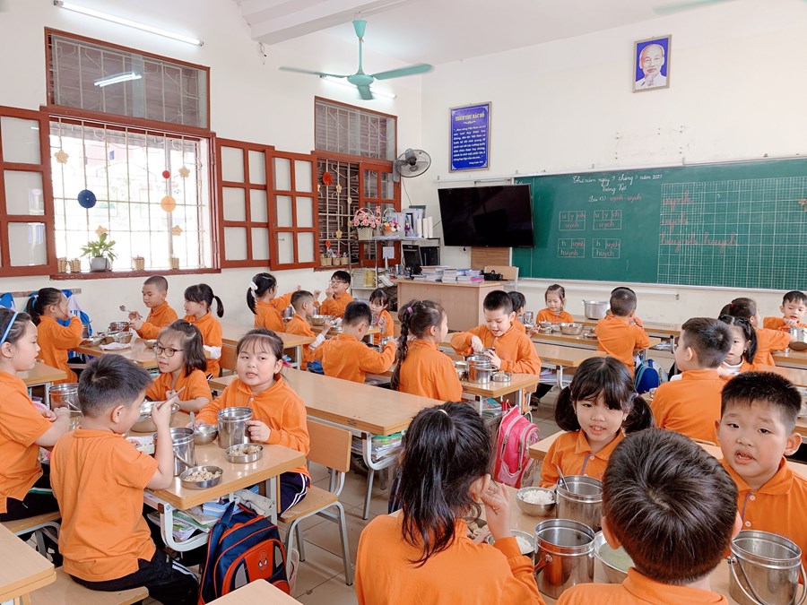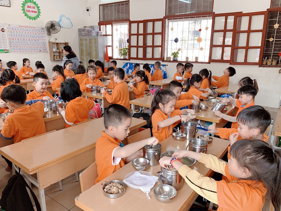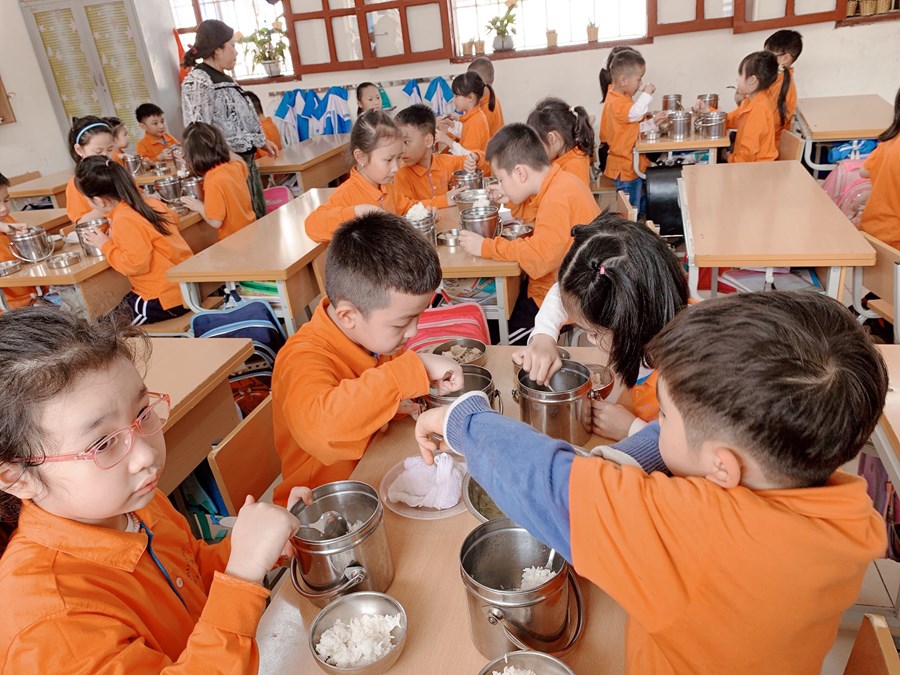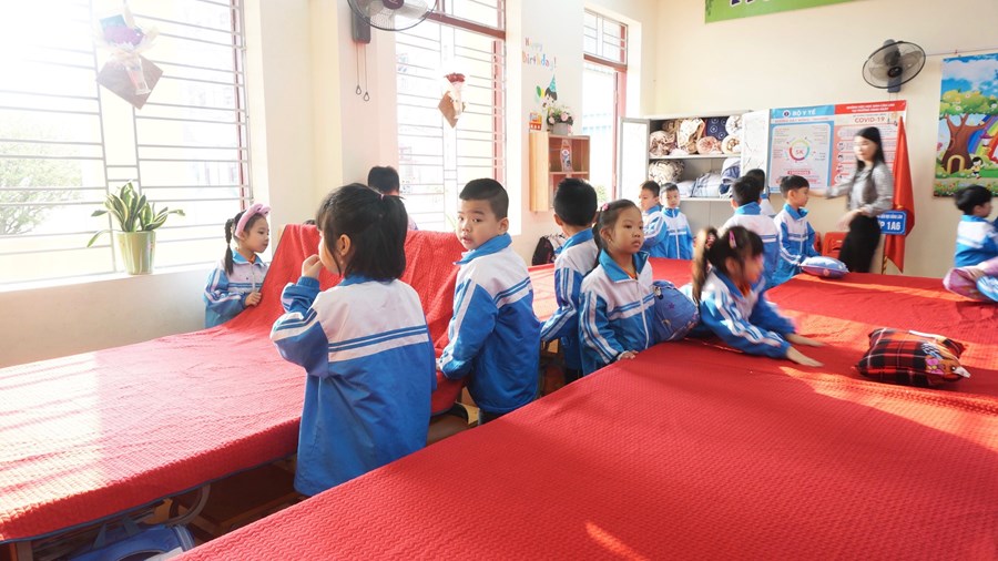 Để thực hiện hiệu quả nhiệm vụ đó, ngay từ lớp 1, các em được giáo viên rèn một số kĩ năng như: vệ sinh trước khi ăn, trải ga, gấp chăn, sắp xếp gối, tự lấy suất cơm, tự sắp xếp đồ dùng cá nhân như bát, thìa,… nhằm giáo dục học sinh biết lao động tự phục vụ, đảm bảo an toàn cho bản thân, cho những người xung quanh và có ý thức bảo vệ sức khỏe, làm đẹp trường lớp. Trước khi ăn, học sinh đều phải rửa tay sạch sẽ, điểm danh và đồng thanh mời thầy cô giáo, bạn bè. Mỗi học sinh 1 suất cơm theo đúng tiêu chuẩn dinh dưỡng, trong bữa ăn hạn chế đi lại, trò chuyện. Các em cũng được rèn ý thức tự giác ăn hết cơm và thức ăn theo suất ăn của mình. Sau khi ăn xong, các em tự mình mang những bát, thìa, cặp lồng, đĩa,… đến để đúng vị trí xếp gọn gàng, ngăn nắp, đi vệ sinh, rửa tay sạch, lau miệng. Sau đó dưới sự hướng dẫn của cô giáo các em lau bàn và lấy ga, chăn, gối sắp xếp để chuẩn bị đi ngủ.