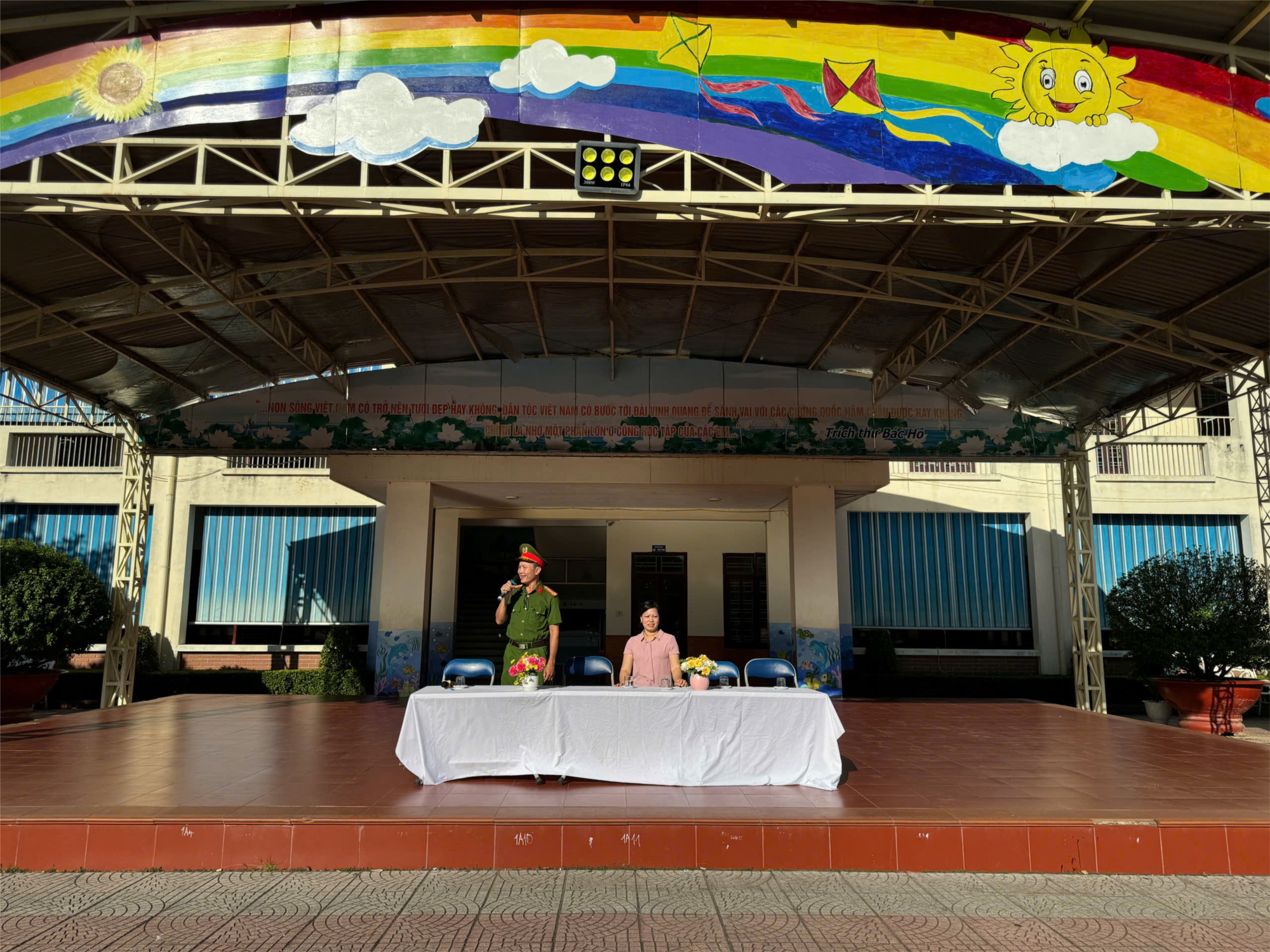 Đặc biệt, nhà trường và lực lượng công an đã phối hợp tổ chức thực tập phương án chữa cháy và cứu nạn cứu hộ giả định. Tình huống được đặt ra là cháy xảy ra tại khu vực phòng học do chập điện. Ngay sau khi có tín hiệu báo cháy, lực lượng PCCC tại chỗ đã nhanh chóng triển khai phương án xử lý, đồng thời phối hợp với Đội Cảnh sát PCCC & CNCH chuyên nghiệp khống chế đám cháy và sơ tán người bị nạn ra khỏi khu vực nguy hiểm. Buổi thực tập diễn ra nghiêm túc, đúng quy trình, đảm bảo an toàn và đã để lại nhiều ấn tượng sâu sắc.