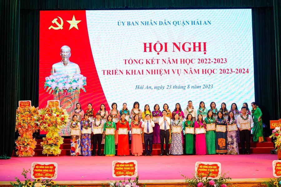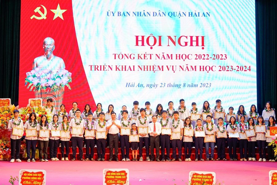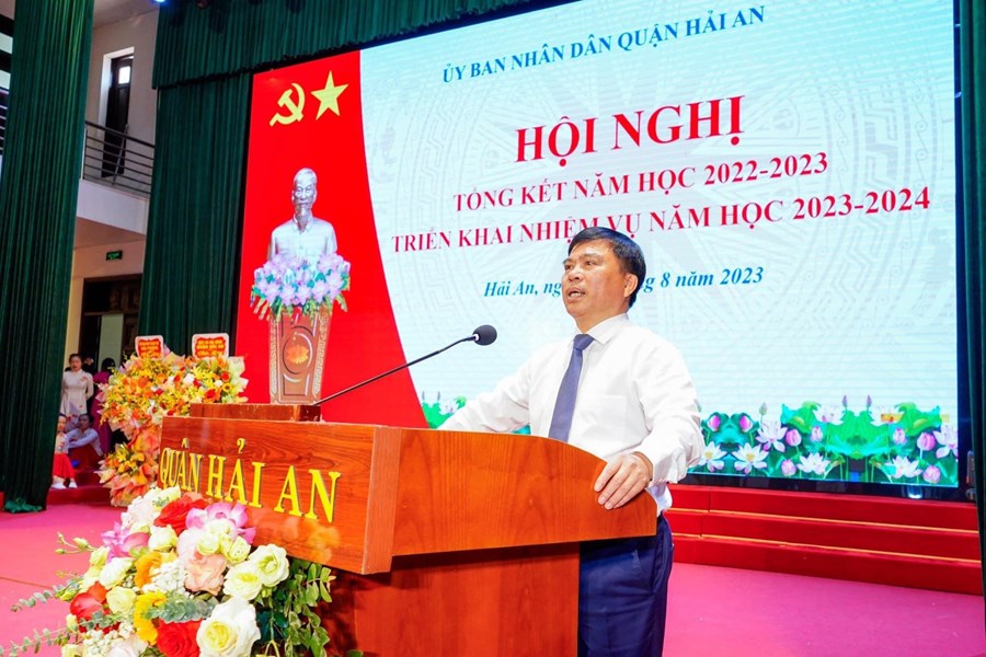 Sáng 23/8, quận Hải An tổ chức hội nghị tổng kết năm học 2022-2023, triển khai nhiệm vụ năm học 2023-2024; Biểu dương, khen thưởng các thầy giáo, cô giáo và các em học sinh đạt thành tích cao trong năm học 2022-2023. Tới dự có các đồng chí: Bùi Văn Kiệm - Giám đốc Sở giáo dục và đào tạo thành phố; Nguyễn Văn Tuấn- TUV- BTQU- Chủ tịch HĐND quận, Dương Đình Ổn- PBT – Chủ tịch UBND quận, Nguyễn Anh Tuấn- Phó bí thư Thường trực Quận ủy, các đồng chí PCT HĐND- UBND quận.