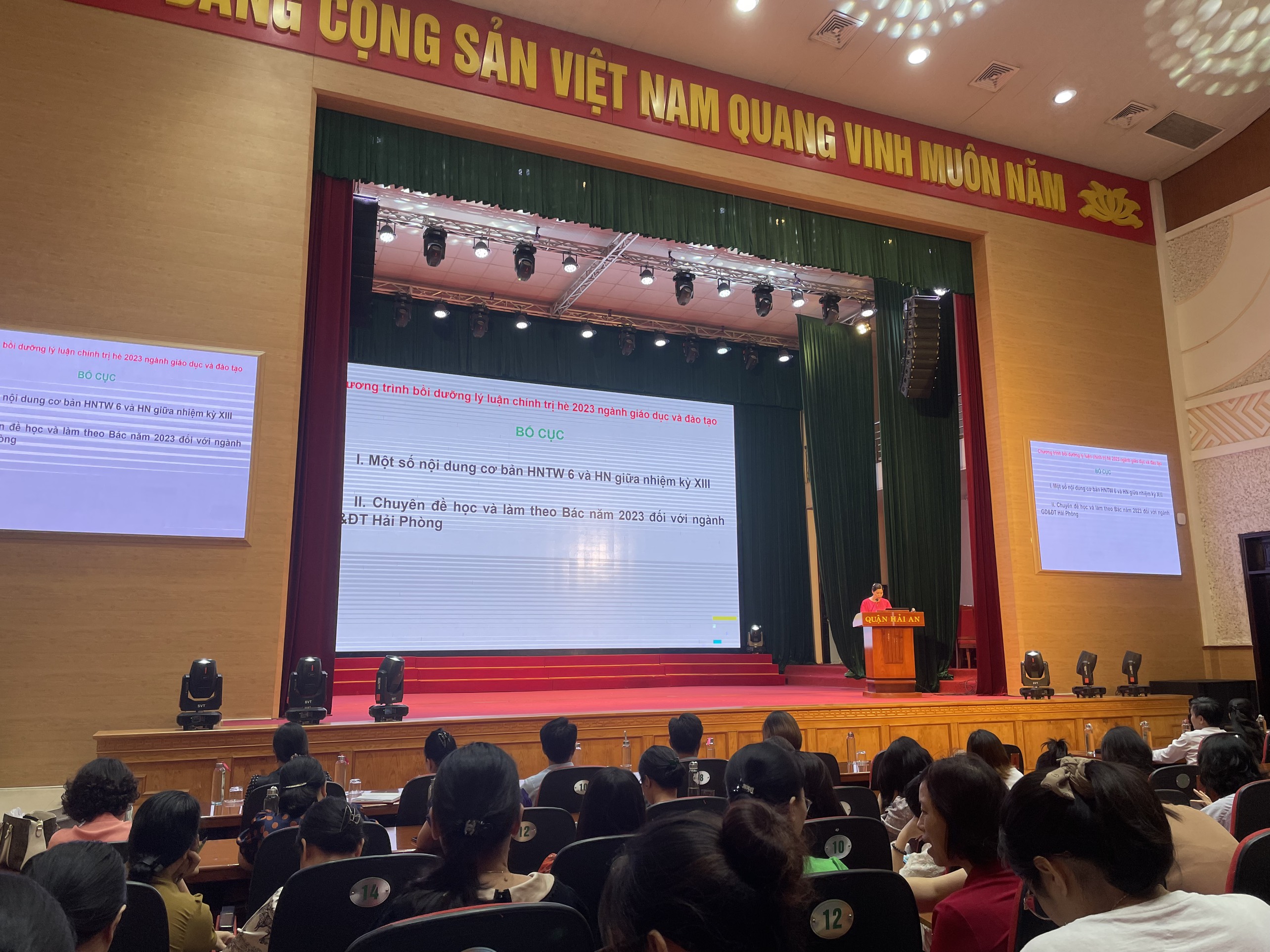 Thực hiện Kế hoạch số 22-KH/BTGQU-PGDĐT ngày 18/7/2023 của Ban Tuyên giáo Quận uỷ - Phòng GD&ĐT về bồi dưỡng chính trị hè cho đội ngũ cán bộ, giáo viên các trường học thuộc quận năm 2023. Sáng ngày 12/08/2023 tại trung tâm Hội nghị quận Hải An, cán bộ, giáo viên và nhân viên nhà trường đã tham gia buổi bồi dưỡng chính trị nghiêm túc.