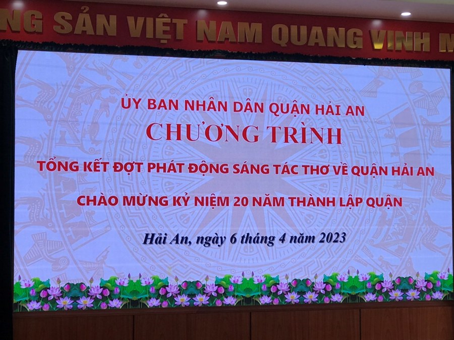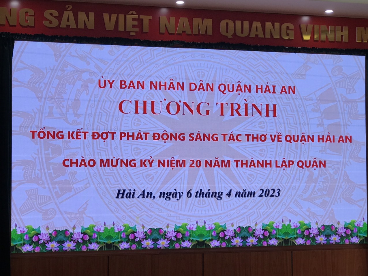 Hướng tới chào mừng kỷ niệm 20 năm thành lập Quận, nhằm ca ngợi và thể hiện nổi bật nét đẹp đặc trưng của vùng đất và con người Hải An, tôn vinh truyền thống văn hóa, truyền thống cách mạng, phản ánh được bản sắc văn hóa các dân tộc, quê hương, thiên nhiên, con người, tiềm năng và thế mạnh của địa phương. Thể hiện khát vọng và sức trẻ của một quận trung tâm dịch vụ thương mại và công nghiệp, góp phần xây dựng thành phố Hải Phòng - thành phố Cảng, đô thị loại I ngày càng giàu đẹp, văn minh. Quận Hải An đã phát động sáng tác nghệ thuật thơ, ca khúc về con người, mảnh đất Hải An trong quá trình hình thành và phát triển. Sau một thời gian phát động đã có 57 bài thơ đạt giải của các tác giả sáng tác.