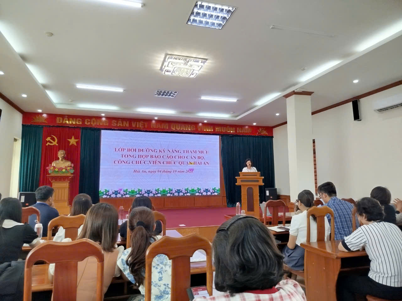 Ngày 04/10/2024, Ủy ban nhân dân quận Hải An tổ chức tập huấn, bồi dưỡng về kĩ năng tham mưu, tổng hợp báo cáo cho đội ngũ cán bộ, công chức, viên chức quận và phường. Lớp tập huấn nhằm trang bị, cập nhật kiến thức, kĩ năng và phương pháp tham mưu, tổng hợp, báo cáo cho đội ngũ cán bộ, công chức quận nhằm nâng cao chất lượng tham mưu của đội ngũ cán bộ, công chức; đảm bảo 100% công chức, viên chức trên địa bàn quận được bồi dưỡng kĩ năng tham mưu, tổng hợp, báo cáo. Đại diện trường Tiểu học Đằng Lâm đã tham gia đầy đủ và tích cực.