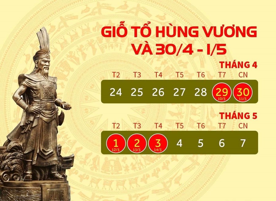 Trường Tiểu học Đằng Lâm xin trân trọng thông báo đến Quý Phụ huynh học sinh lịch nghỉ các ngày lễ Giỗ tổ Hùng Vương, 30 tháng 4 và Quốc tế Lao động 1/5 như sau: